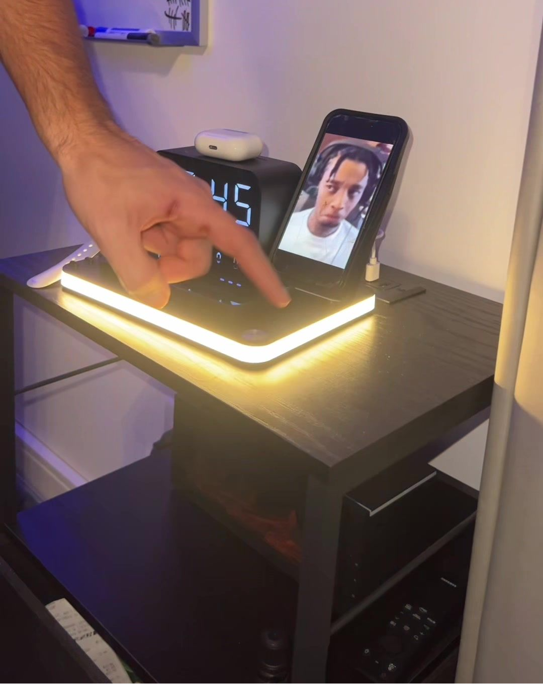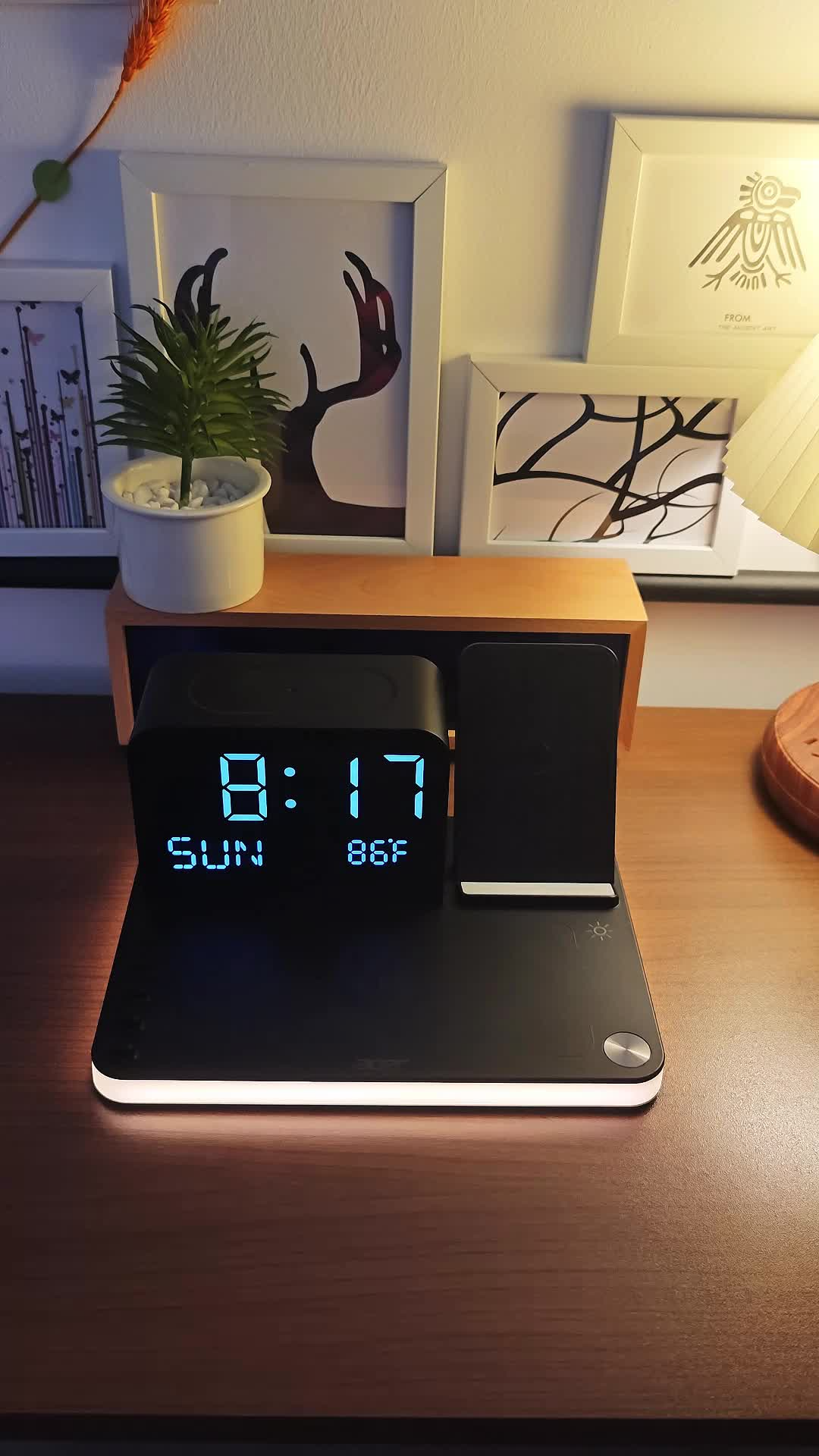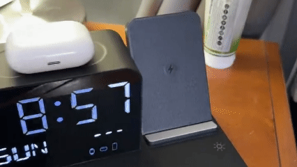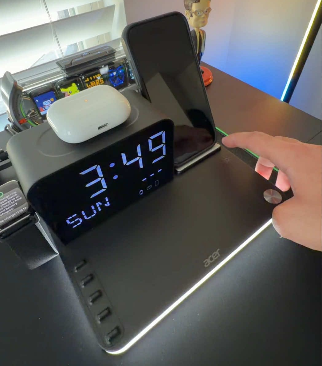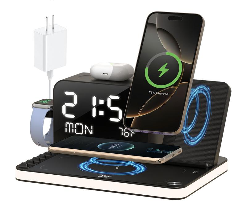 Organiza y potencia tu espacio con la Estación de Carga Inalámbrica 7 en 1 Cavari™. Carga tu iPhone, Android, Apple Watch y AirPods al mismo tiempo, mientras disfrutas de su luz LED nocturna y reloj Bluetooth con temperatura. Ideal para tu escritorio o mesa de noche.